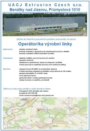 Společnost UACJ Extrusion Czech s.r.o. nabízí volná pracovní místa operátora výrobní linky a seřizovače výrobní linky.